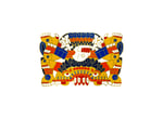 Tlaltecuhtli [Tlal-teh-koo-tlee] is also known as "earth lord." Her body was the foundation for the world in the Aztec creation story. In carvings, she is often depicted as a reptilian creature with split arms and legs, as shown on the pin.